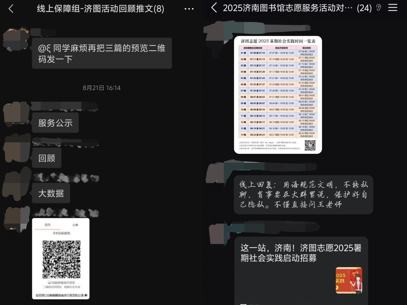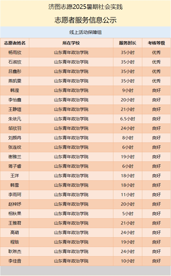 在本次暑期实践中,启明星青年志愿服务社主要负责线上保障工作。团队成员分工明确、协作高效,承担了数据统计、表格制作、活动素材汇总、推文撰写、志愿服务证明系统维护、群内答疑与日常沟通等任务。这些基础性工作,展现出志愿者的专业素养与责任担当。从规范整理公示信息与照片材料、精心打磨多期推文,到标准化完成系统上传、持续不断的答疑交流,线上保障组的同学们以严谨、细致、负责的态度,确保活动各环节平稳运行,为暑期实践活动的顺利开展提供了有力支持,充分体现出团队高效的凝聚力与执行力。