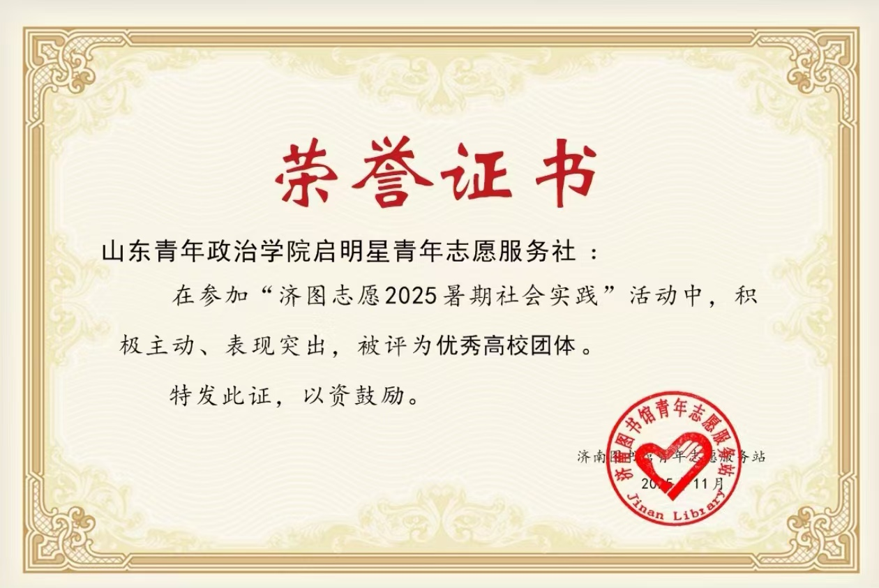 2025年11月,政治与公共管理学院启明星青年志愿服务社荣获“济图志愿2025暑期社会实践”活动“优秀高校团体”荣誉称号。据悉“济图志愿2025暑期社会实践”活动由济南图书馆与泉城书房联合开展,活动中社团志愿者勇于担当、积极奉献,累计服务时长达429.5小时,以积极的工作态度和出色的业务能力得到了主办方的一致认可与好评,充分展现了青年一代昂扬向上的精神面貌和扎实肯干的服务品质,以实际行动诠释了“奉献、友爱、互助、进步”的志愿精神。