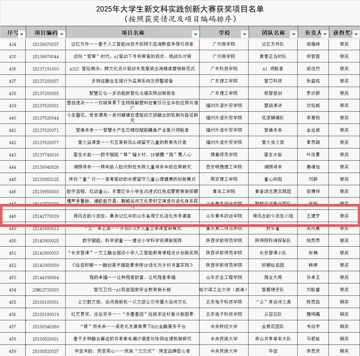 11月28日至30日,2025年大学生新文科实践创新大赛总决赛在西安交通大学顺利举办。我校大舜文化志愿宣讲团“舜风古韵今犹在”团队凭借项目《舜风古韵今犹在:集体记忆中的山东省舜文化活化传承调查》在激烈角逐中脱颖而出,成功晋升国赛并荣获银奖。