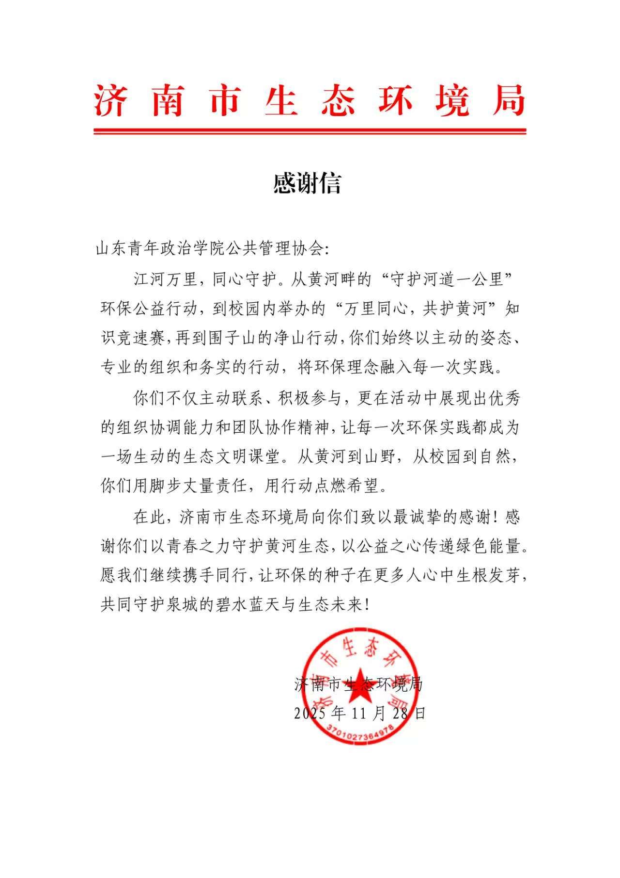 活动结束后,济南市生态环境局相关负责人表示:“公共管理协会的同学们以主动的姿态、专业的知识,让每一次环保实践都成为生动的生态文明课堂。”这份感谢信,不仅凝聚着济南市生态环境局对协会的真诚感谢,更承载着其对协会环保实践工作的高度肯定。未来,公共管理协会将进一步开拓创新,丰富环保活动形式,以青春之力传递绿色理念,为生态环境保护贡献青年智慧与青春力量。