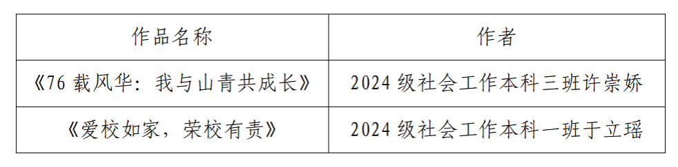 在本次大赛中,来自2024级社会工作本科三班许崇娇和社会工作本科一班于立瑶荣获一等奖。获奖的两幅作品均以“爱校荣校”为主题,生动展现了学校峥嵘岁月与昂扬进取的精神风貌,抒发了对学校的深厚情感与真挚祝福。在《76载风华:我与山青共成长》作品中,以建校76周年为线索,用钟楼、图书馆、校门等元素,唤起大家与山青院在岁月长河中相伴成长的生命图景;《爱校如家,荣校有责》作品里,则巧妙将爱校情怀与荣校担当融入画面之中,突出学校校碑讲学楼等标志,是爱校情感的升华。她们把对学校的爱展现在海报里的色彩点滴,她们的作品不仅洋溢着青春的朝气与风采,更映照出学校在历史传承中始终葆有的激情与活力,激励我们在未来道路上继续砥砺前行、共创美好。