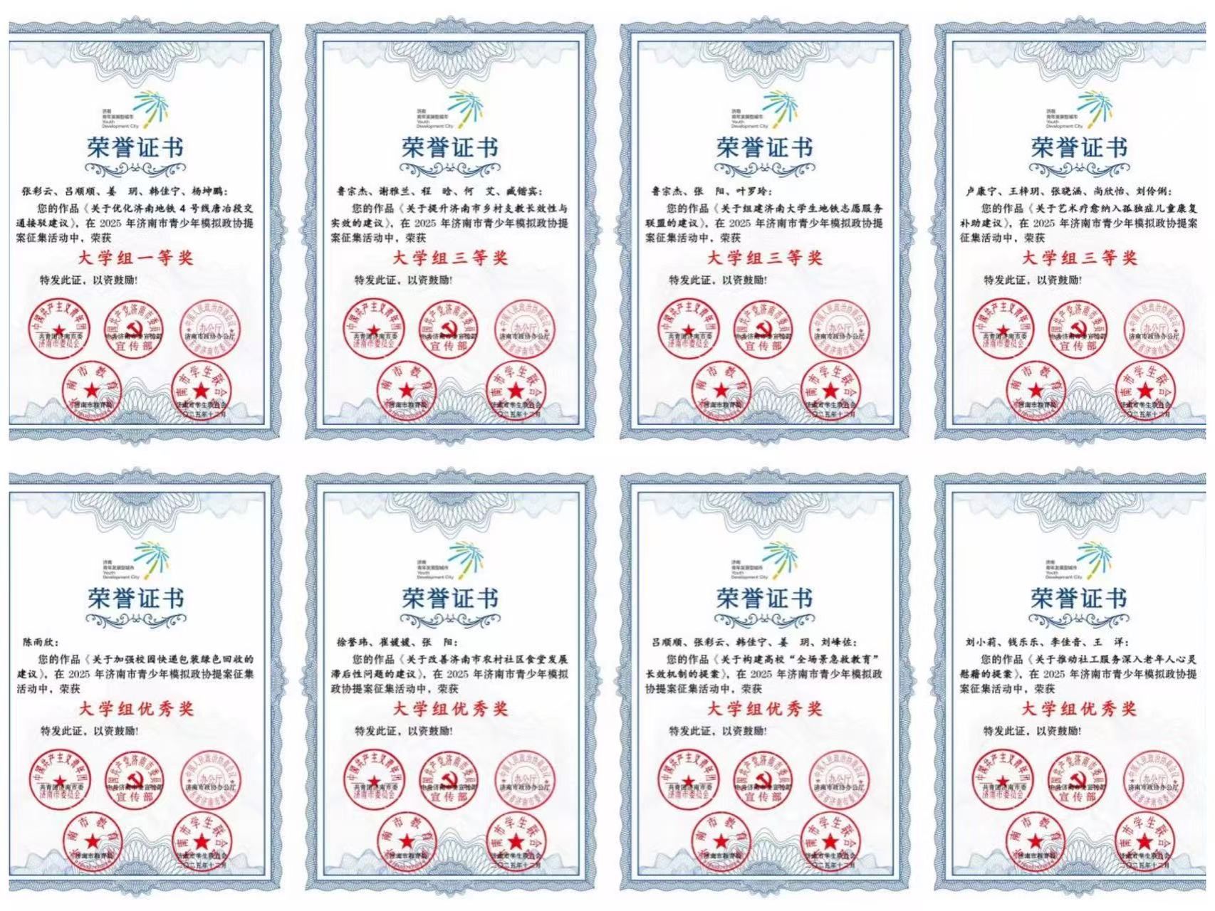 12月18日,由共青团济南市委、中共济南市委宣传部、济南市政协办公厅、济南市教育局、济南市学生联合会共同主办的2025年度济南市青少年模拟政协提案征集活动获奖名单正式公布。我校学子凭借扎实的专业素养与敏锐的社会洞察脱颖而出,最终斩获一等奖1项、三等奖3项、优秀奖8项,教师张恩韶获评“表现突出指导老师”荣誉称号。