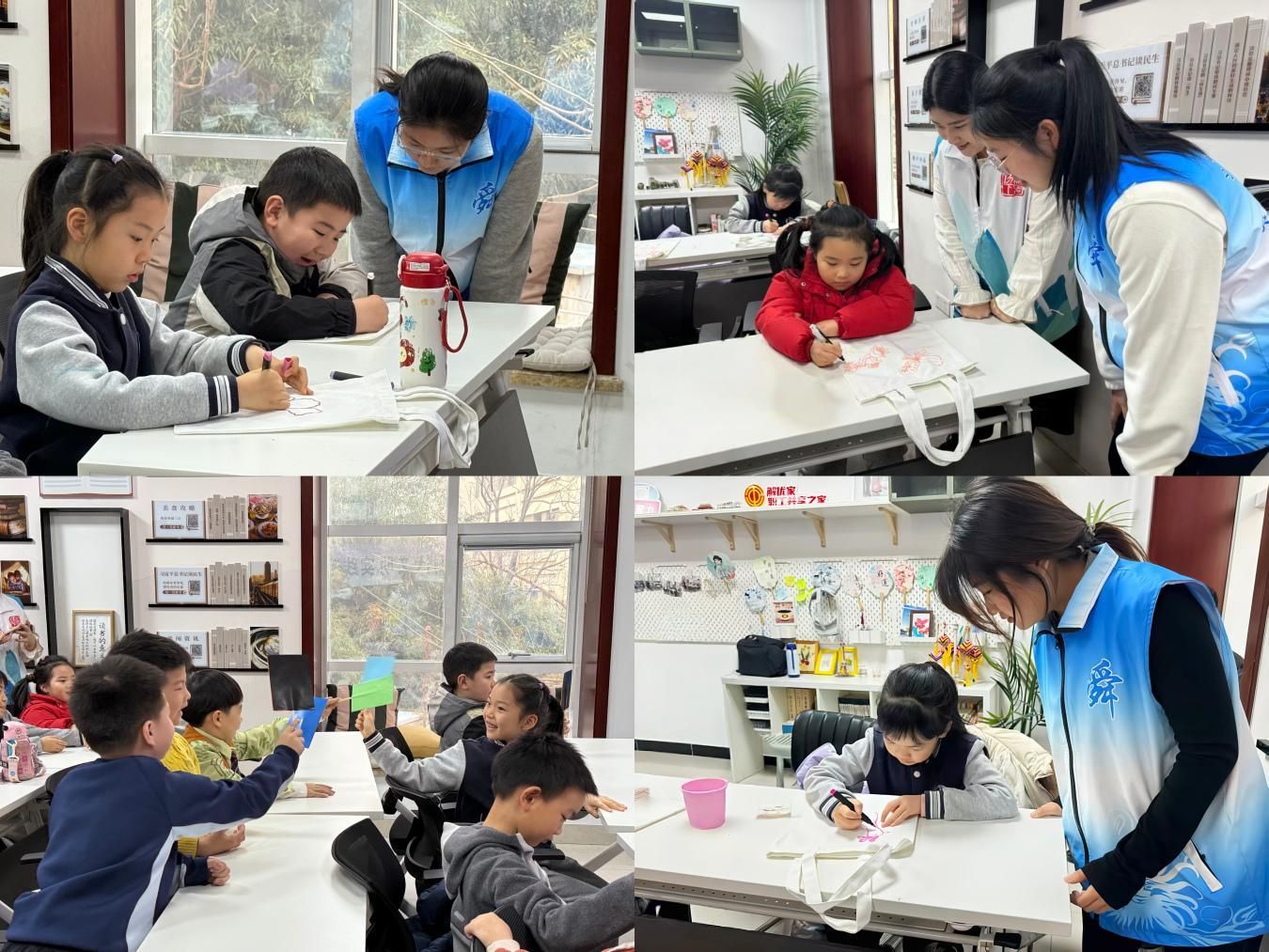 随后,活动进入了趣味游戏环节。“色彩苍蝇拍”游戏紧张有趣,孩子们手执双面色苍蝇拍,专注聆听志愿者发出的色彩指令,迅速做出反应。这一环节不仅有效锻炼了孩子们的反应力和专注力,更在潜移默化中传递了舜文化中“和谐共处、相互尊重”的精神内涵。在“舜德小布包”绘制活动中,孩子们充分发挥想象力,用五彩颜料在空白布包上描绘出各类与舜文化相关的图案。从构思到落笔,每一件手工作品都充满了个人特色,也凝聚了孩子们对传统文化的理解与热爱。活动结束后,大家自豪地展示自己的成果,并积极交流制作过程中的心得与收获,现场洋溢着浓厚的文化氛围。