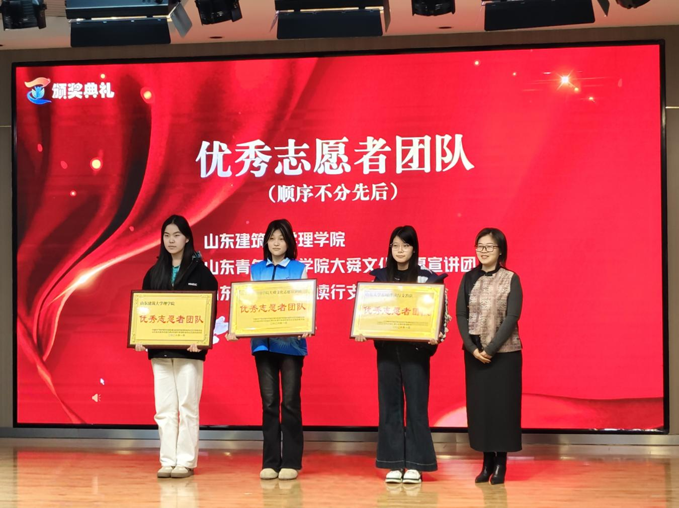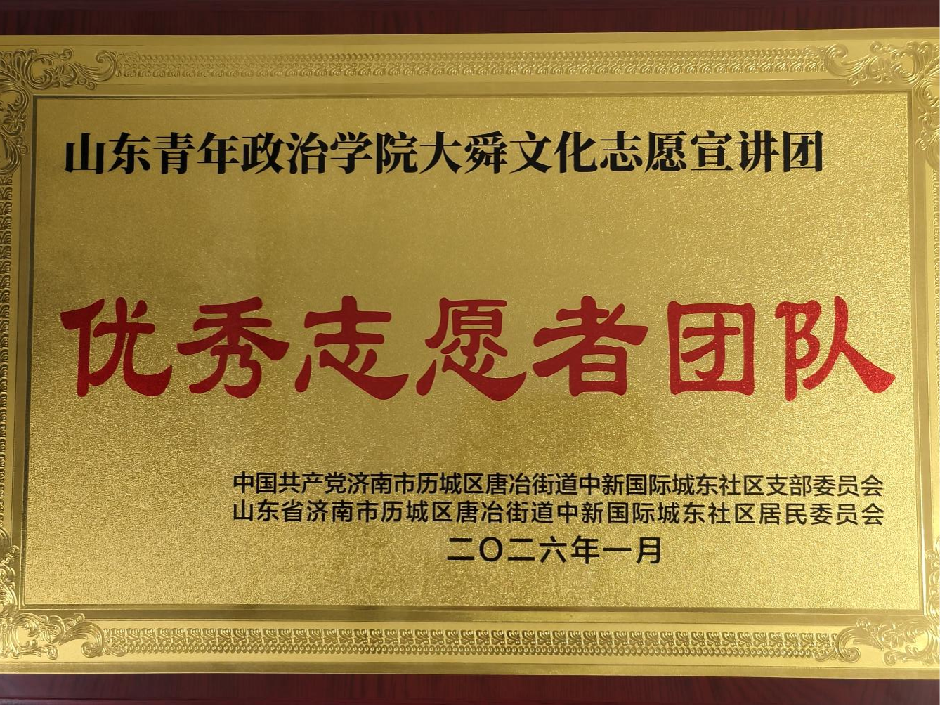 1月16日,济南市唐冶街道中新国际城东社区举办“福启新程·致敬同行”2025年度颁奖典礼。山东青年政治学院大舜文化志愿宣讲团凭借长期以来在舜文化传播与社区志愿服务中的优异表现,荣获“优秀志愿者团队”荣誉称号。这一荣誉既是对宣讲团长期以来扎根社区、传承文化的充分肯定,更是学院深化校地共建、推进文化育人实践的生动写照。