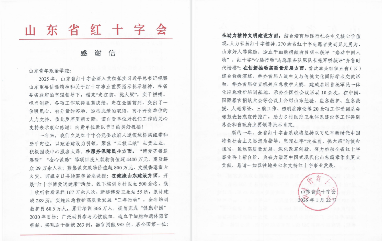 近日,山东省红十字会向山东青年政治学院政治与公共管理学院发来感谢信,对学院连续两届全力支撑山东省红十字志愿服务项目大赛决赛、高质量完成承办保障工作致以诚挚谢意。这份感谢信既是对师生辛勤付出的肯定,也彰显了学院立足专业特色、深耕志愿服务、践行公益育人理念的责任担当。