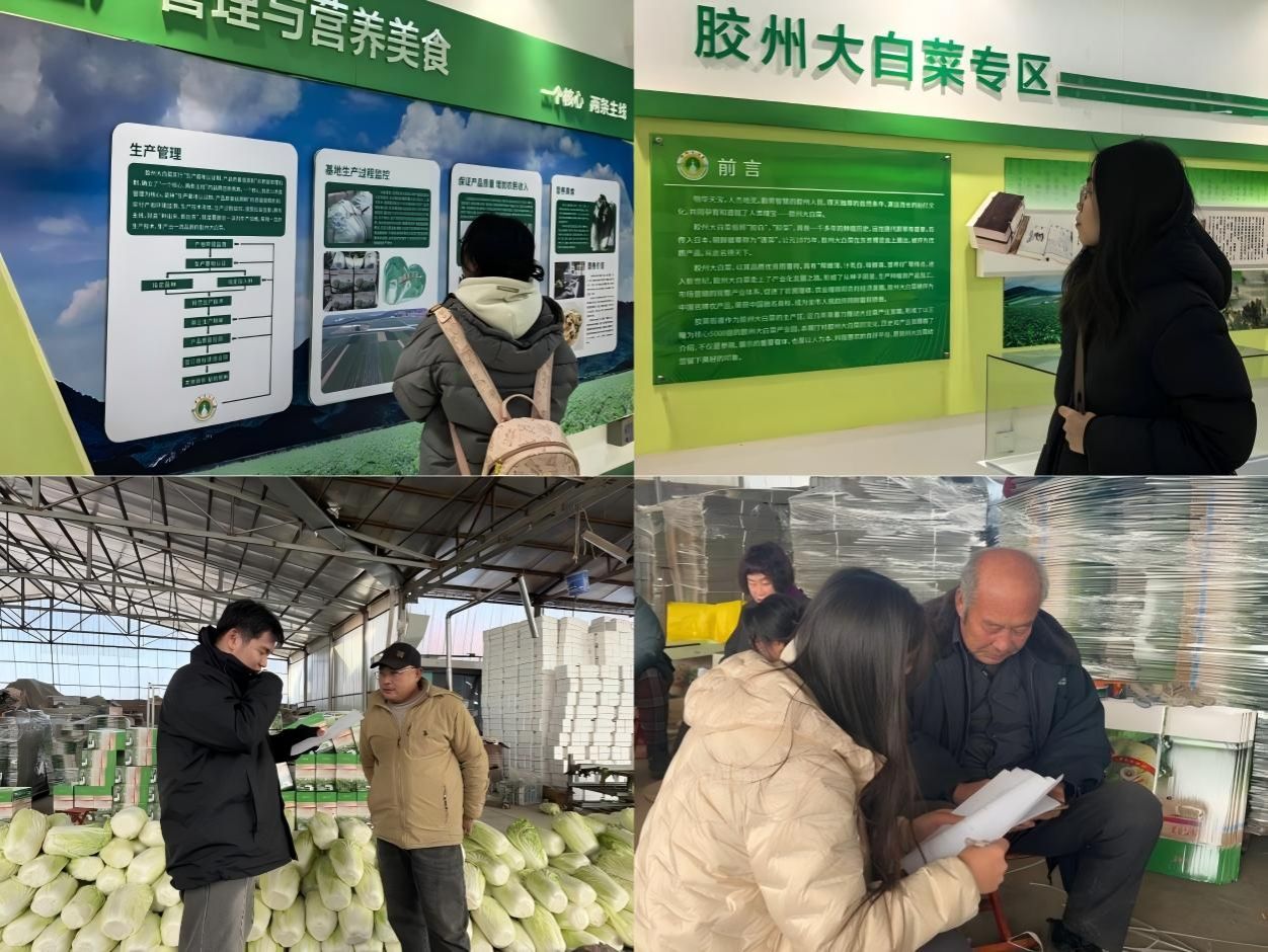 青岛胶州农业资源禀赋突出,孕育了胶州大白菜、大葱、生姜等特色鲜明的地理标志农产品。实践期间,团队走进胶州大白菜专属展厅,系统梳理其历史文化脉络,深入了解标准化种植流程与规范化生产模式;随后深入田间地头,走进农产品种植基地开展调研访谈。团队与基地工作人员围绕产量规模、采收周期、销售渠道等关键环节进行深入交流,全面掌握产业发展现状,为后续产销对接与项目设计提供了扎实的数据支撑。