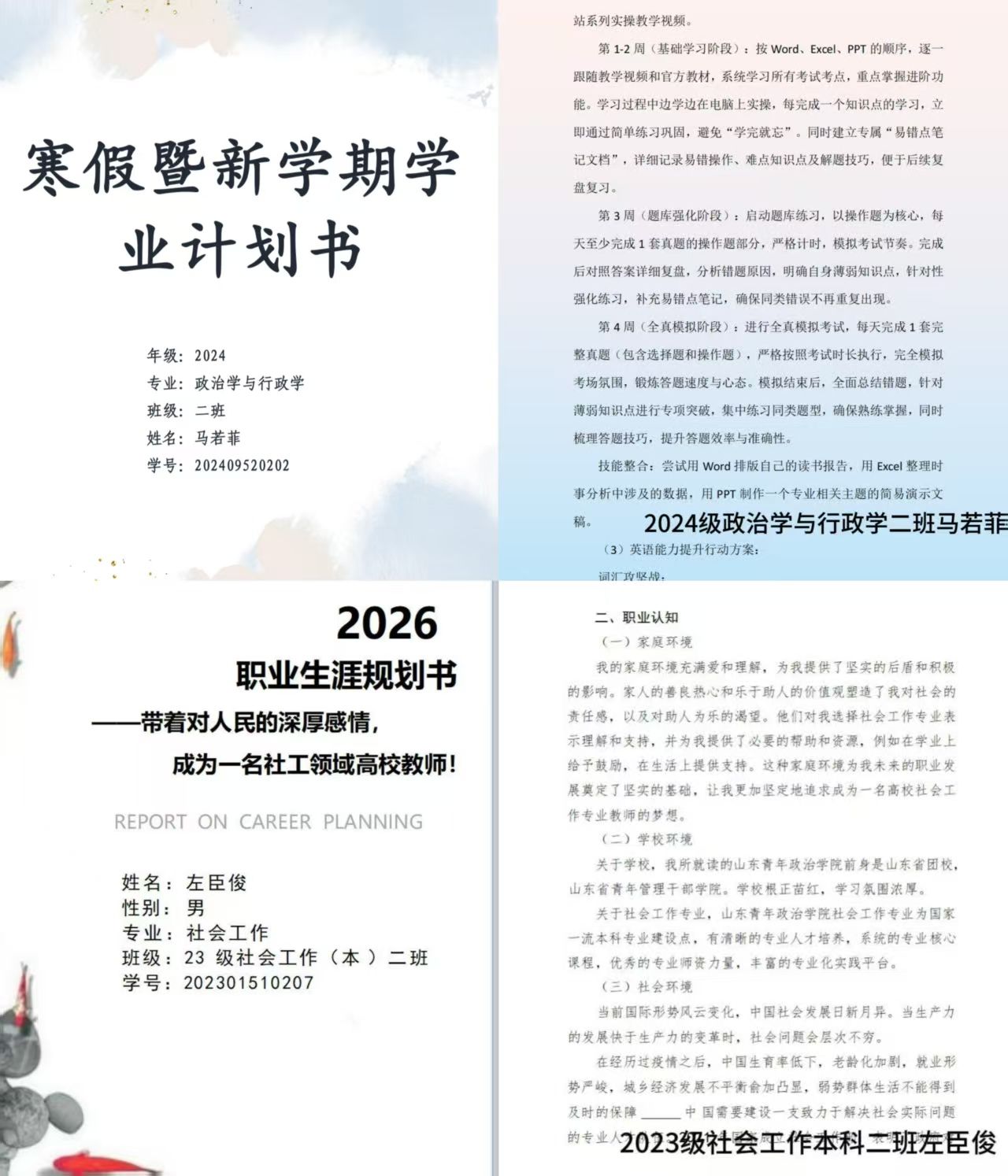活动自开展以来便受到学院学生的广泛关注与积极参与。学生围绕个人专业发展方向、学业目标与长远职业愿景,系统撰写《寒假暨新学期学业/生涯发展计划书》。规划内容不仅包含课程学习、科研训练、技能提升等学业安排,还融入了社会实践、志愿服务与综合素质拓展等内容,充分展现了政管学子立足实际、面向未来的系统思考与行动自觉。