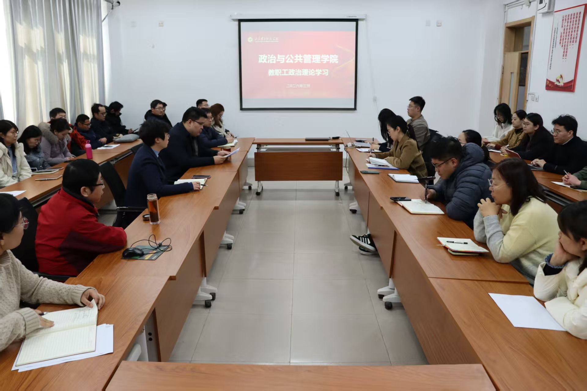 3月12日,政治与公共管理学院在敏行楼104会议室开展教职工政治理论暨意识形态工作专题学习,学院党委书记王正坤主持并领学,全体教师参会。