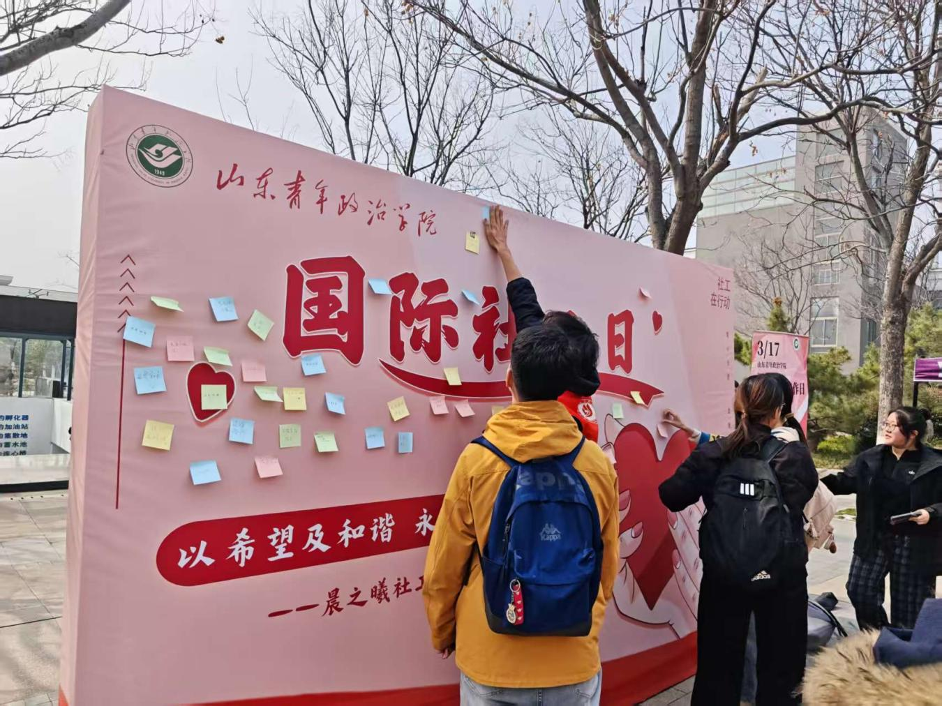 为进一步传递社工价值、彰显社工担当,普及社会工作专业知识,提升社会工作在校园的影响力与认同感,3月17日,在第20个“国际社会工作日”来临之际,政治与公共管理学院晨之曦社工协会在南北苑之间组织开展“以希望及和谐,永续幸福社会”国际社工日主题活动。政治与公共管理学院党委副书记庞翠、团总支书记于晓光、辅导员王婧参加活动。