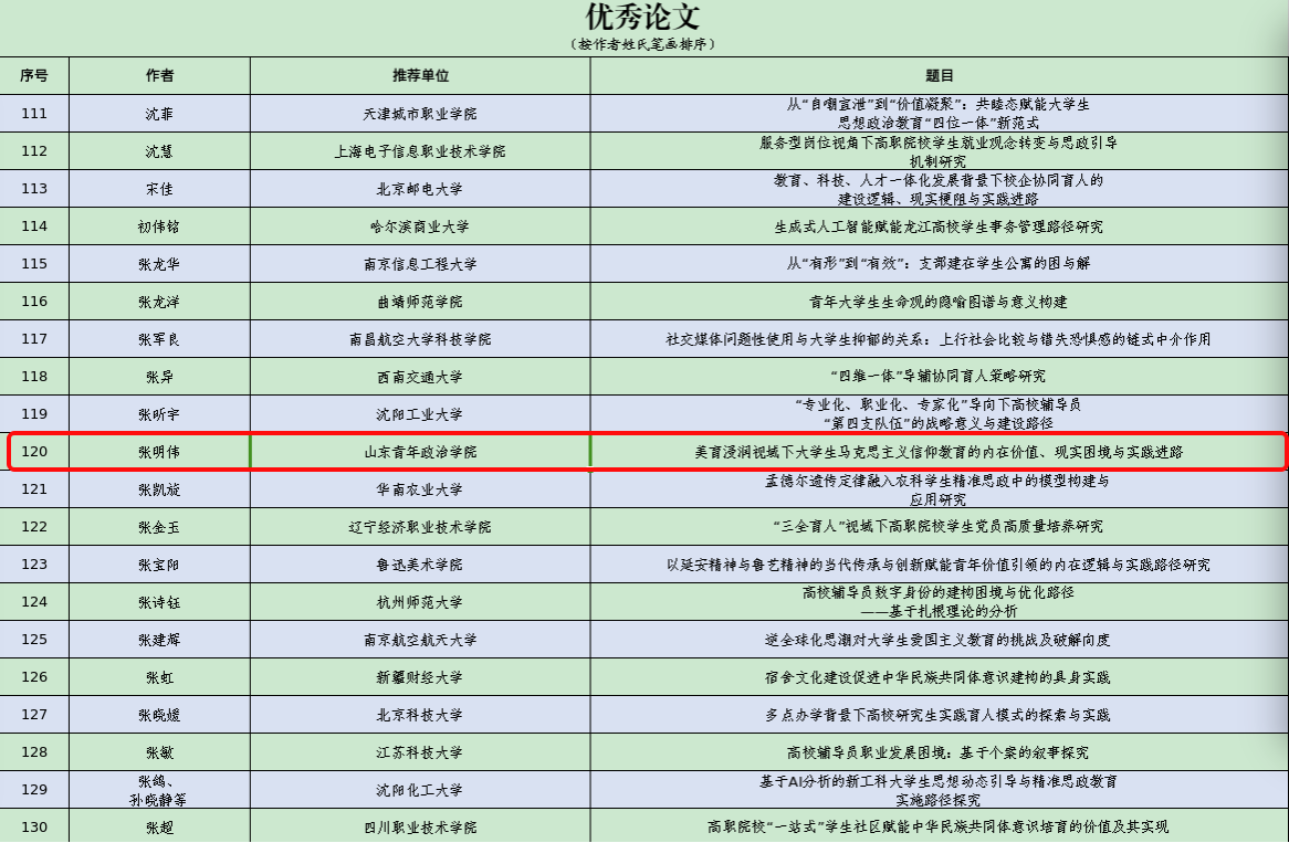 张明伟凭借《美育浸润视域下大学生马克思主义信仰教育的内在价值、现实困境与实践进路》一文,在全国高校思政工作优秀作品评选中脱颖而出,斩获优秀论文奖项。该成果立足新时代大学生思想特点与信仰教育实际,探索美育与思政教育融合路径,体现了我院辅导员深耕一线、潜心研究、以研促教的专业素养与理论水平,为学院思政教育创新发展提供了有力支撑。