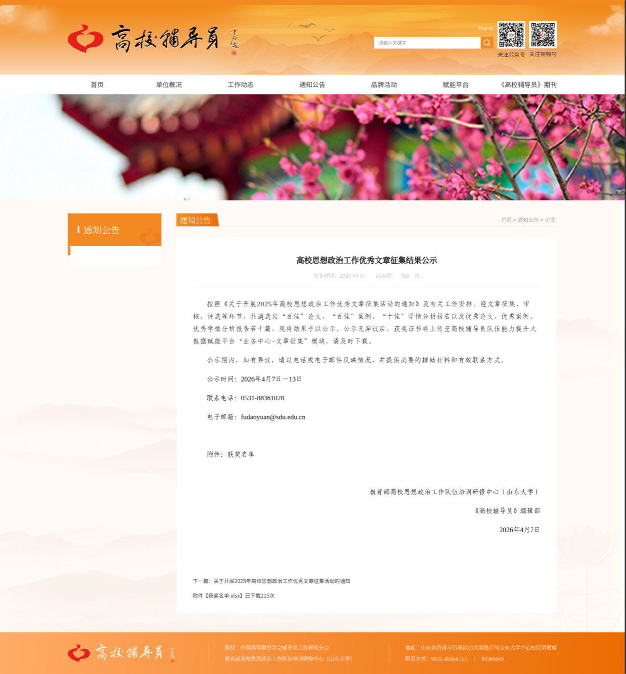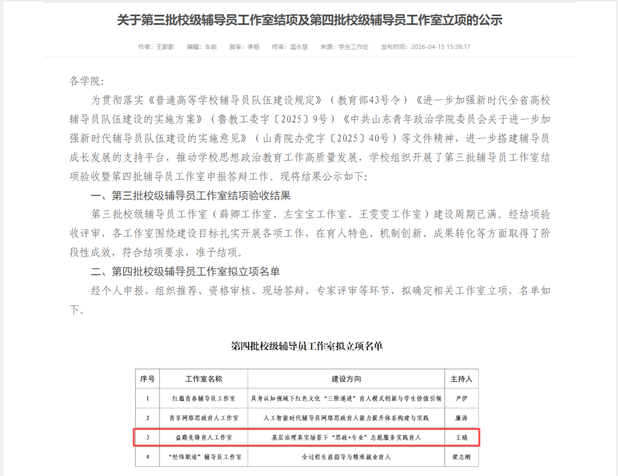 近期,在教育部高校思想政治工作队伍培训研修中心(山东大学)组织的2025年高校思想政治工作优秀作品评选中,学院辅导员张明伟撰写的论文获评全国优秀论文;我校学生工作处公布《关于第三批校级辅导员工作室结项及第四批校级辅导员工作室立项的公示》,学院辅导员王婧主持的益路先锋育人工作室成功获批立项。学院辅导员队伍屡获佳绩,彰显了学院在辅导员专业化、职业化建设方面的扎实成效与育人实力。