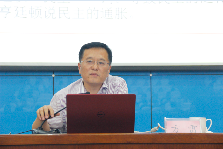 6月6日下午,由我校科研处主办,政治与公共管理学院承办的第三十一期学术前沿论坛于我校图书馆学术报告厅顺利举行。山东大学博士生导师方雷应邀做了题为《民主的样式与优劣》的学术报告。政治与公共管理学院院长王玉香,政治学与行政学专业全体师生共同聆听了此次报告会。会议由王玉香主持。