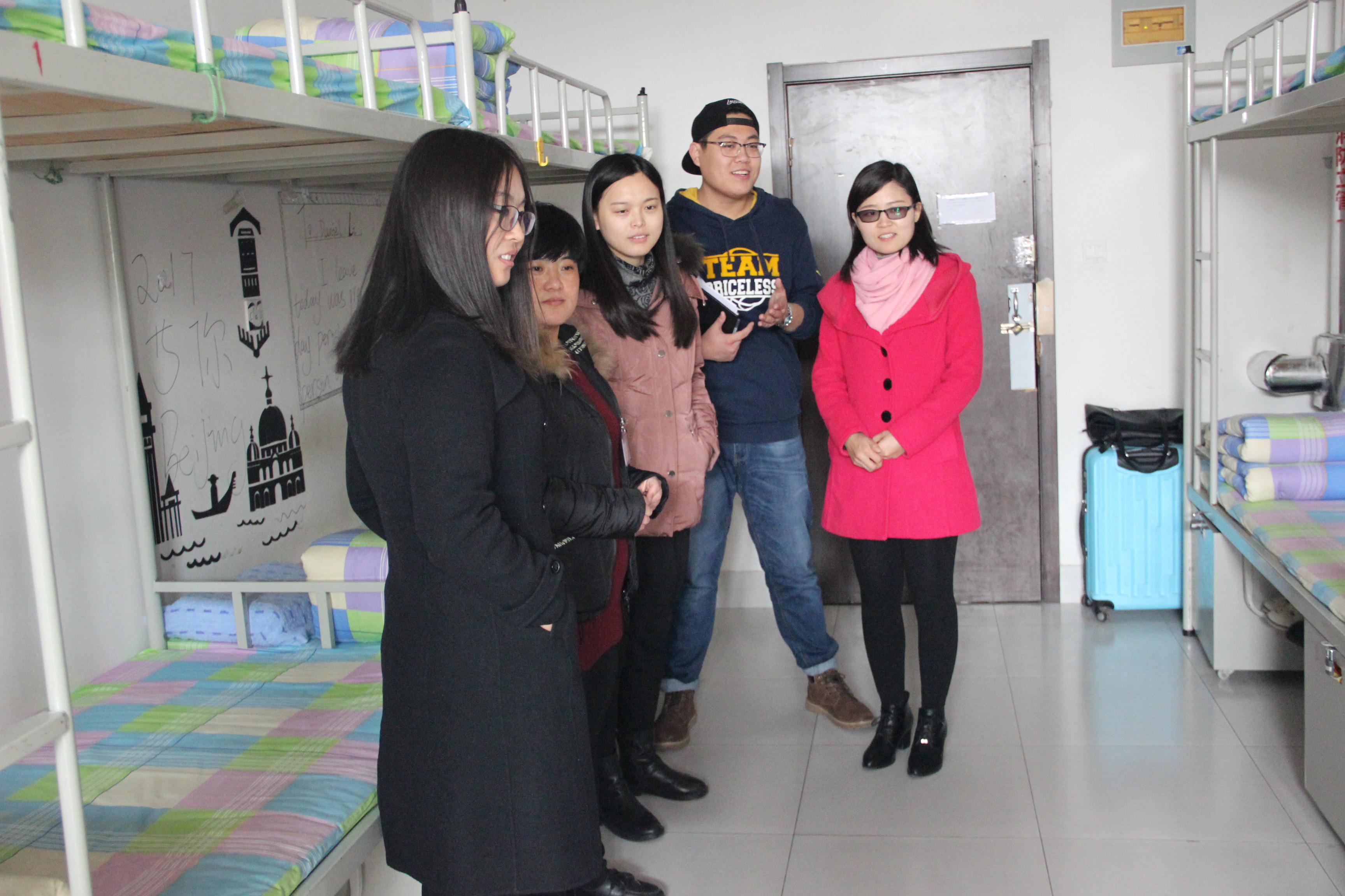 11月30日,“大家一起来找茬”活动则以宿舍间互查安全卫生问题的形式让同学们在趣味性游戏中牢记宿舍安全卫生标准。辅导员毛田惠、陈越男,公寓楼长房娣也进入宿舍,关心学生宿舍暖气供暖情况,查摆问题,消除宿舍隐患。