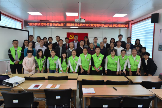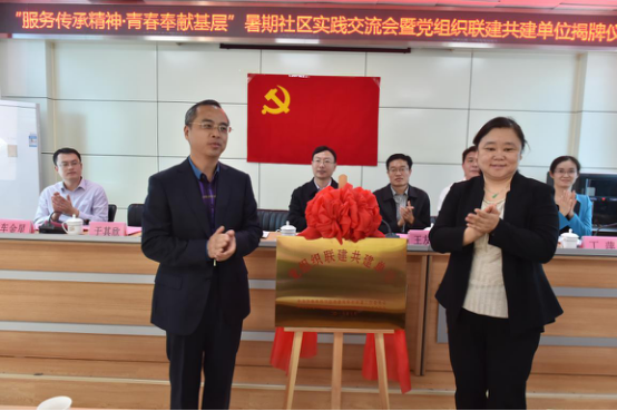 2016年10月14日上午,为充分发挥党组织的带动、示范、领导职能,探索高校和社区的合作领域和路径,拓展青年学生实习实践的平台,更好地引导青年服务基层,奉献社会,政治与公共管理学院党总支和建筑新村街道办事处党工委在建筑新村街道办事处和平新村社区居委会举行了“服务传承精神·青春奉献基层”暑期社区实践交流会暨党组织联建共建单位揭牌仪式。共青团山东省委书记、学院党委书记张涛、共青团济南市委副书记王友进、建筑新村街道党工委书记包昆、共青团历下区委书记车金星、我校党委组织部副部长商和利、政治与公共管理学院党总支书记于其欣、副书记丁萍出席了揭牌仪式,社区、教师及学生党员代表、项目社工、实践团队负责人等共计60余人参加了活动。仪式由包昆主持。