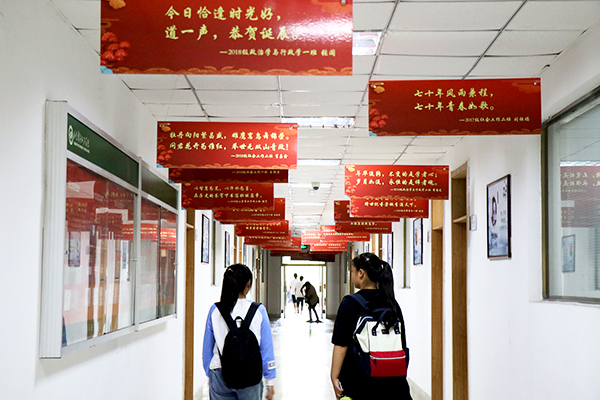 政管学院从色彩心理学角度出发,设计制作了“政管学子献给祖国的1219个祝福”主形象墙,将1219名政管学院学子写给中华人民共和国成立70周年和校庆70周年美好祝福的“心表白”,粘贴在国旗图案上,1000余颗红心和鲜艳的五星红旗交相辉映、相得益彰。“祝福祖国母亲生日快乐”“树立远大理想,热爱伟大祖国,练就过硬本领,用青春和汗水报效祖国” “新时代是奋斗者的时代,作为中国的青年一代大学生,要有锲而不舍的奋斗精神,用奋斗点亮青春”一段段深情的祝福,一句句庄严的承诺,激荡着政管学子的赤诚之心,激发了政管人的爱国志、报国情。