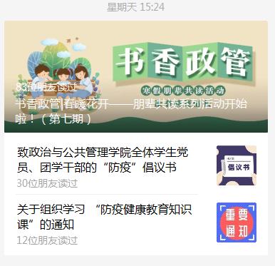 在假期延长、抗击疫情的关键时期,大学生自主地做好学业规划和管理有助于今后更好地学习,对于充实生活、调整身心也具有重要的作用。学院在鼓励学生减少外出的同时,积极开展线上线下活动,丰富学生的假期生活。近日,学院组织各年级团支部召开“防控疫情,共克时艰”特别主题团日活动,引导团员青年做好时间规划。2月2日,发起“春暖花开——书香政管朋辈共读系列活动”,包含“单词打卡四周计划”及经典书目共读两项活动,共吸引学院359名同学报名参加。此外,“此刻,我想对你说”征文比赛、“疫情防控”主题海报、视频设计制作等活动正有序开展。