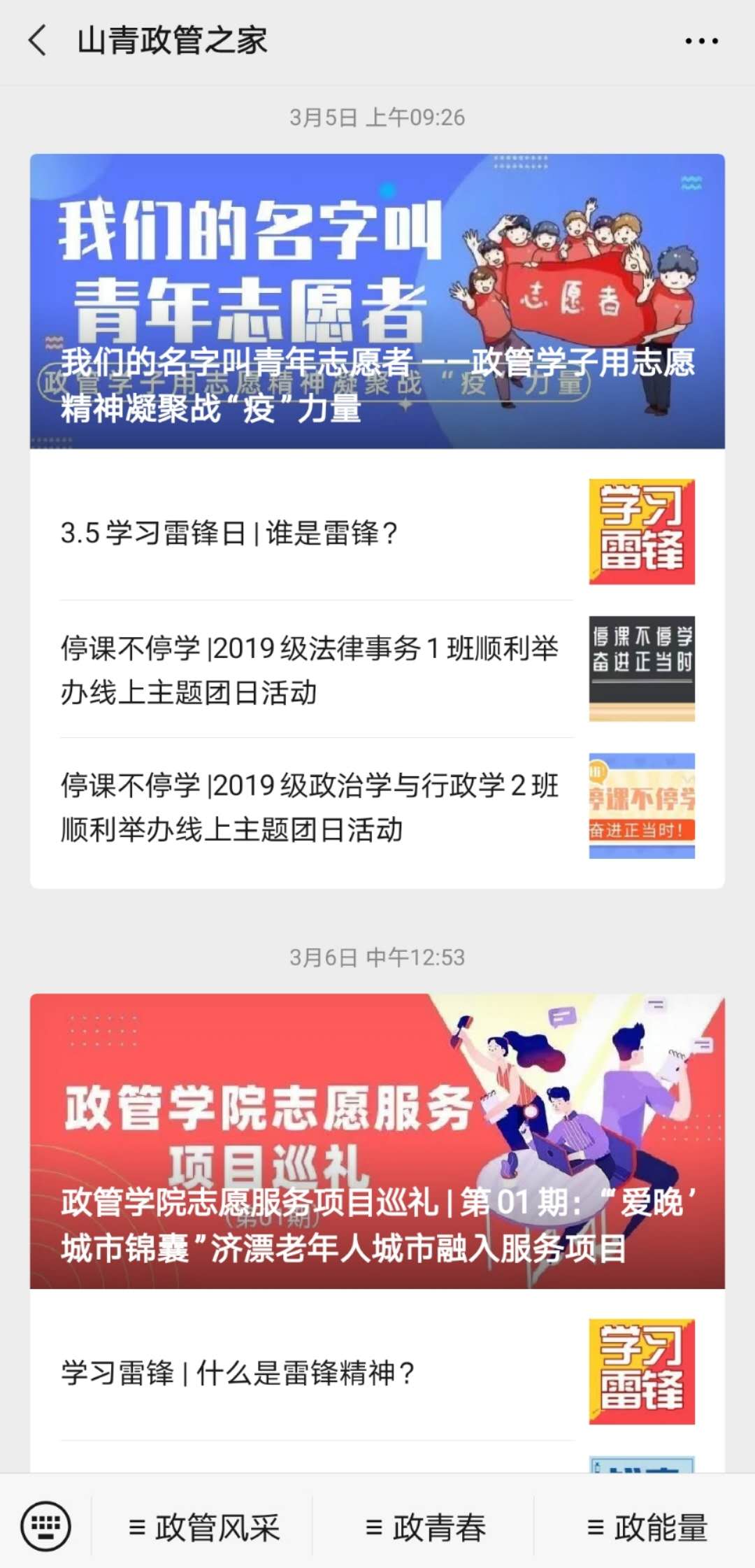 学院团总支充分发挥新媒体阵地作用,构建新媒体矩阵,集中发声,做好正面宣传教育。截止目前,学院依托“山青政管之家”微信公众号累计发布推文118篇。其中,“同心战疫”专栏15篇、“停课不停学”专栏13篇、主题团日活动专栏10篇、“有爱在‘云’端”专栏3篇、“青春战役日记”4篇,“幸福像花儿一样”专栏5篇、 “线上‘微团课’,‘微’你而来!”专栏3篇。