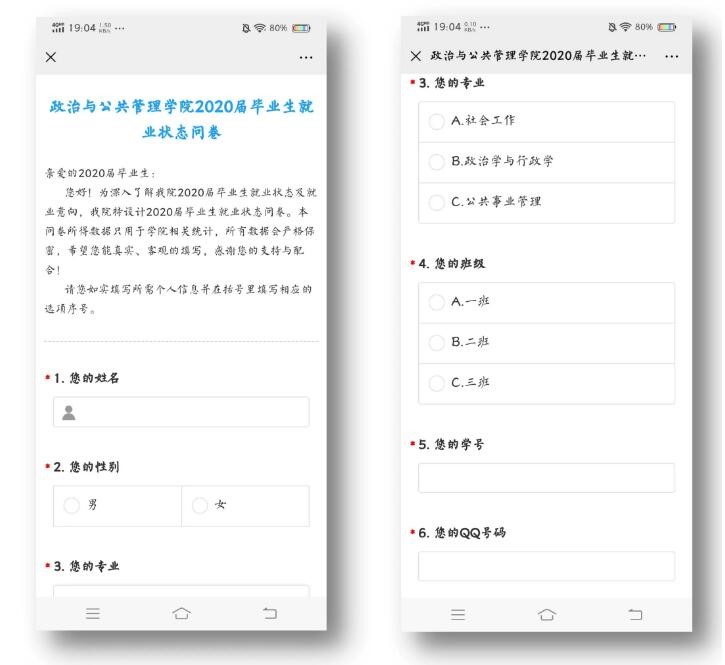 学院辅导员积极组织学生开展线上问卷,全面调研政管学院2020届毕业生当前基本信息、就业意向、考研复试信息、选调结果等,重点围绕考研、考公务员、选调生、事业编考试、实习中和西部计划几种类型进行摸底,2020届毕业生269份问卷全部回收。