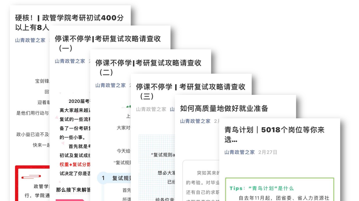 学院以微信公众号、网络群组等形式构建了多个就业信息交流平台,汇总学校推送、各教研室、各专业教师和合作就业单位的信息,在疫情期间有效推送了大量相关就业信息。一是通过网络群组“政管学院班主任群”和“2016级政管班长群”推送就业信息三十余次;二是通过微信公众号“山青政管之家”推送了“如何高质量地做好就业准备”、“‘职’等你来and‘职’为你来”系列、“考研复试攻略请查收”系列等文章十余篇,积极营造就业氛围,为毕业生安心宅家就能实现就业夯实基础。