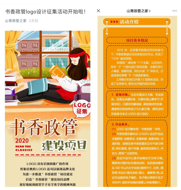 学院读书月系列活动结合目前疫情实际情况,将于4月中旬至5月底持续开展系列线上活动。一是计划广泛开展“阅读悦青春”读书月主题班会、主题团日活动,进一步营造良好的读书氛围,形成人人读书好风尚;二是开展系列表彰评选活动。对上学期“书香政管”项目建设中组织得力、表现优异的个人和集体进行线上表彰,选树“书香班级”和院级“阅读之星”;三是征集评选“书香政管”建设项目品牌Logo形象,展现政管学子乐学善学的精神风貌,确立书香政管2020年发展计划;四是依托线上平台分阶段开展“最美书评”征集、“第23页第4行”好书分享、“放下手机 静读一小时”等活动。