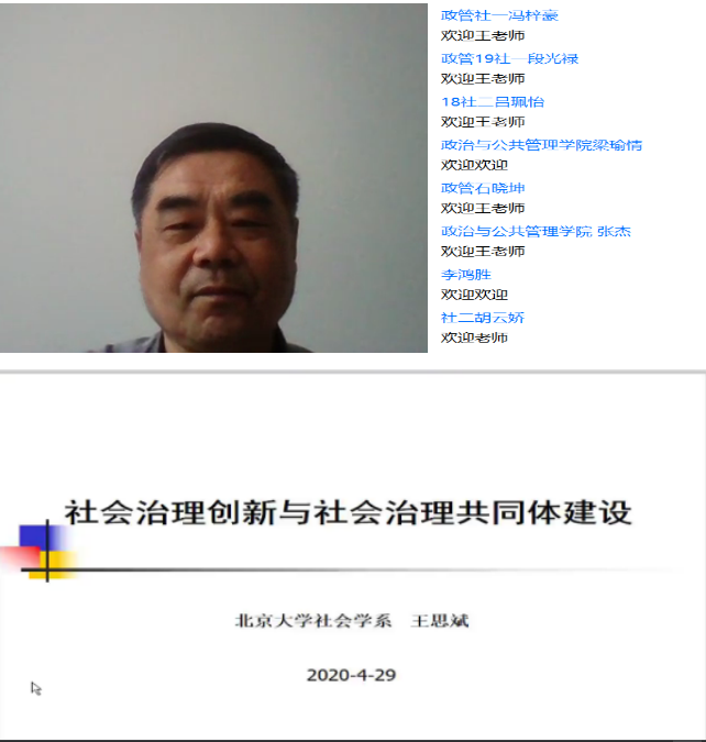 4月29日下午,由山东青年政治学院科研处主办,政治与公共管理学院、山东省社区发展与社会工作研究中心承办的我校第七十二期学术前沿论坛暨第三十九期社区治理论坛通过腾讯会议系统举办。中国社会工作学会会长、北京大学一级教授、博士生导师王思斌教授为大家带来了题为《社会治理创新与社会治理共同体建设》的讲座,讲座由政管学院院长王玉香教授主持,政管学院部分师生参加。