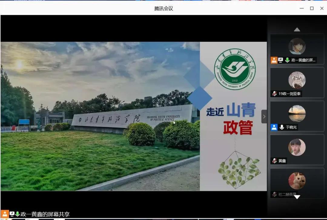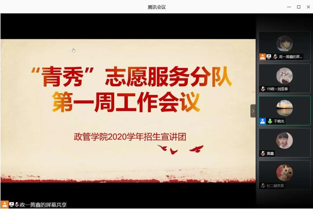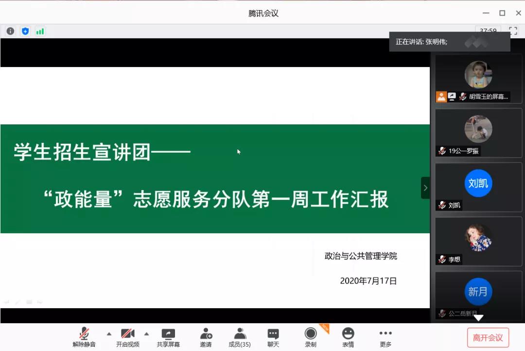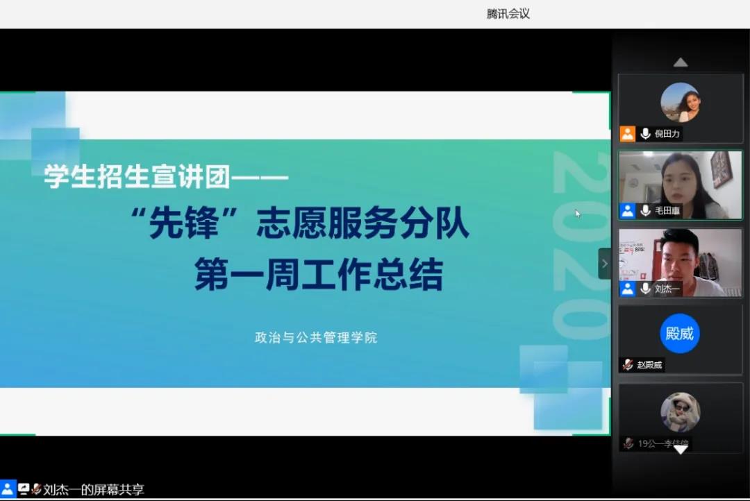 7月17日下午,政管学院学生招生宣讲团“先锋”志愿服务队、“政能量”志愿服务队、“政青春”志愿服务队、“青秀”志愿服务队一周工作总结会在线上召开,指导教师毛田惠、张明伟、于晓光主持各会场,各服务队全体队员参会。