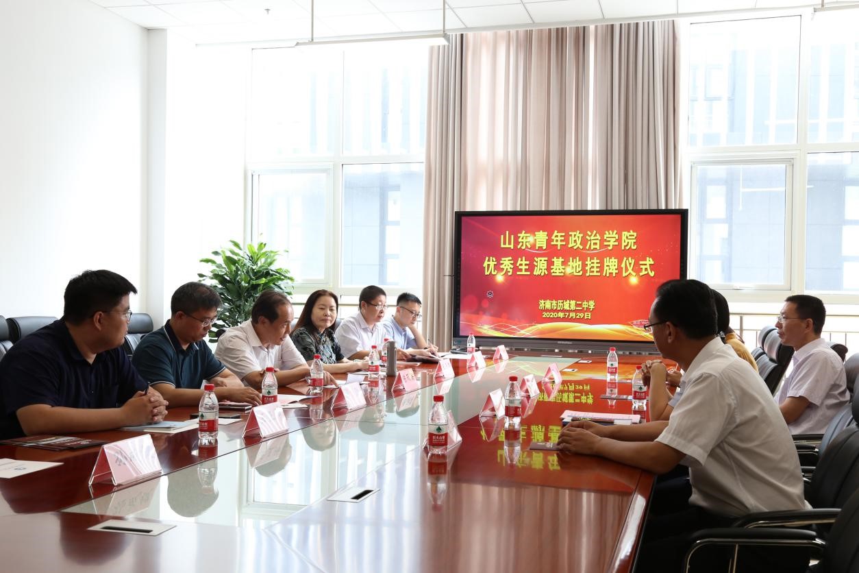 7月29日,校党委委员、副院长陈雨海,政治与公共管理学院院长王玉香,教务处副处长杜聪,政治与公共管理学院副院长张剑,党总支副书记王正坤,副院长卢鹏程,社会工作教研室教师孙成键前往济南市历城第二中学开展优质生源地建设工作。济南市历城第二中学副校长李矿水、校党委副书记王萍、校办公室主任李玉华、校团委书记张宇参加基地签约挂牌仪式并进行专题座谈交流。