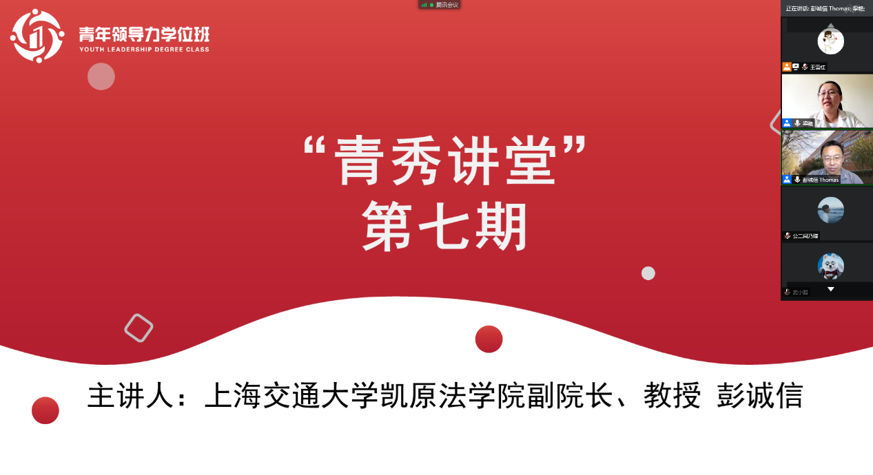 8月18日下午,政治与公共管理学院通过腾讯会议APP举办了青年领导力学位班第七期“青秀讲堂”。上海交通大学凯原法学院副院长彭诚信教授应邀做了题为《民法典的基本内容与要点解读》的专题讲座。青年领导力学位班运营团队全体成员、青年领导力学位班任课教师和全体学员、政管学院法律事务专业学生参加了本次活动,讲座由政管学院副院长梁艳主持。