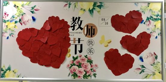 “教诲如春风,师恩似海深,桃李满天下,春晖遍四方。祝老师教师节快乐!”敏行楼大厅展板上贴满了由同学们精心制作的卡片,师生们纷纷驻足观看、拍照留念。