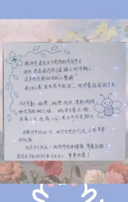 政管学院的学生王志豪,以“师者风华,最美如您”为题向全体教师写了一封信。信中写道:“我敬爱的老师,今天是您的节日,学生们唯有心怀尊重与爱意才能不负您的嘱托。我们何其幸运,能在人生中最美好的时期遇见最可敬可爱的老师们!师者万千风华,不染世俗风尘是您,深谙世事人情是您,认真严苛是您,温柔善良亦是您。政管学院全体学子向所有辛勤工作的老师们致以崇高的敬意!”