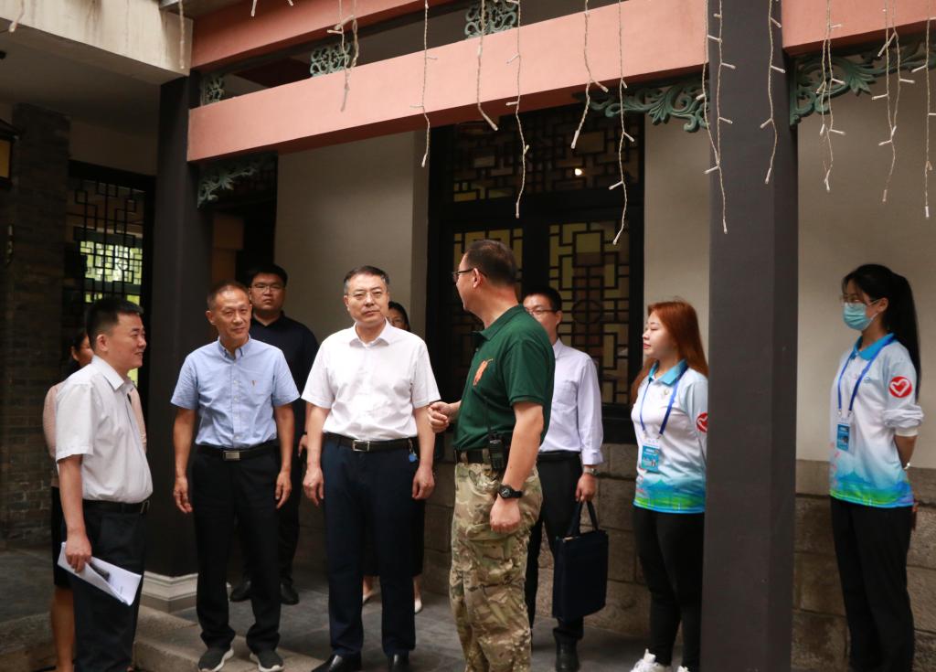 9月16日上午,济南团市委书记黄晓广、山东青年政治学院党委副书记高峰、济南市文旅局副局长郭象峥、济南团市委副书记徐冬梅、团市委志工部部长刘江、山东青年政治学院团委书记孟祥佳、政治与公共管理学院院长王玉香、党总支副书记王正坤一行来到2020山东省旅发大会百花洲历史文化街区分会场,看望慰问正在参加志愿服务的山青志愿者。