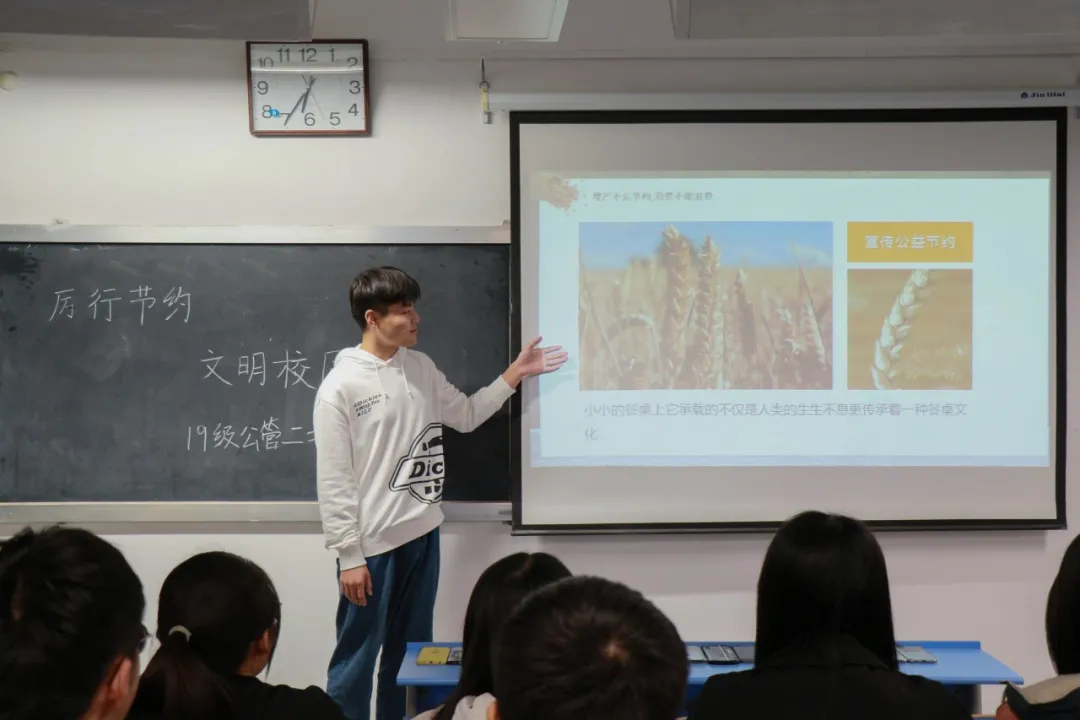在学院团总支的指导下,政管学院以班级为单位召开“厉行节约,文明校园”主题班会。各班在学习《山东青年政治学院文明公约》精神的基础上,结合社会现象和具体事例,通过PPT讲解、观看公益片、游戏互动、倡议书宣读等多种形式,引导同学们反思自身浪费行为,深刻认识节约意义。“我觉得厉行节约、杜绝浪费是每个人都应该做到的事,作为当代大学生更应该牢固树立勤俭节约光荣、铺张浪费可耻的观念,自觉抵制浪费”,主题班会结束后,2019级政治学与行政学专业的姜昱同学明确表达了从我做起、厉行节约的决心。