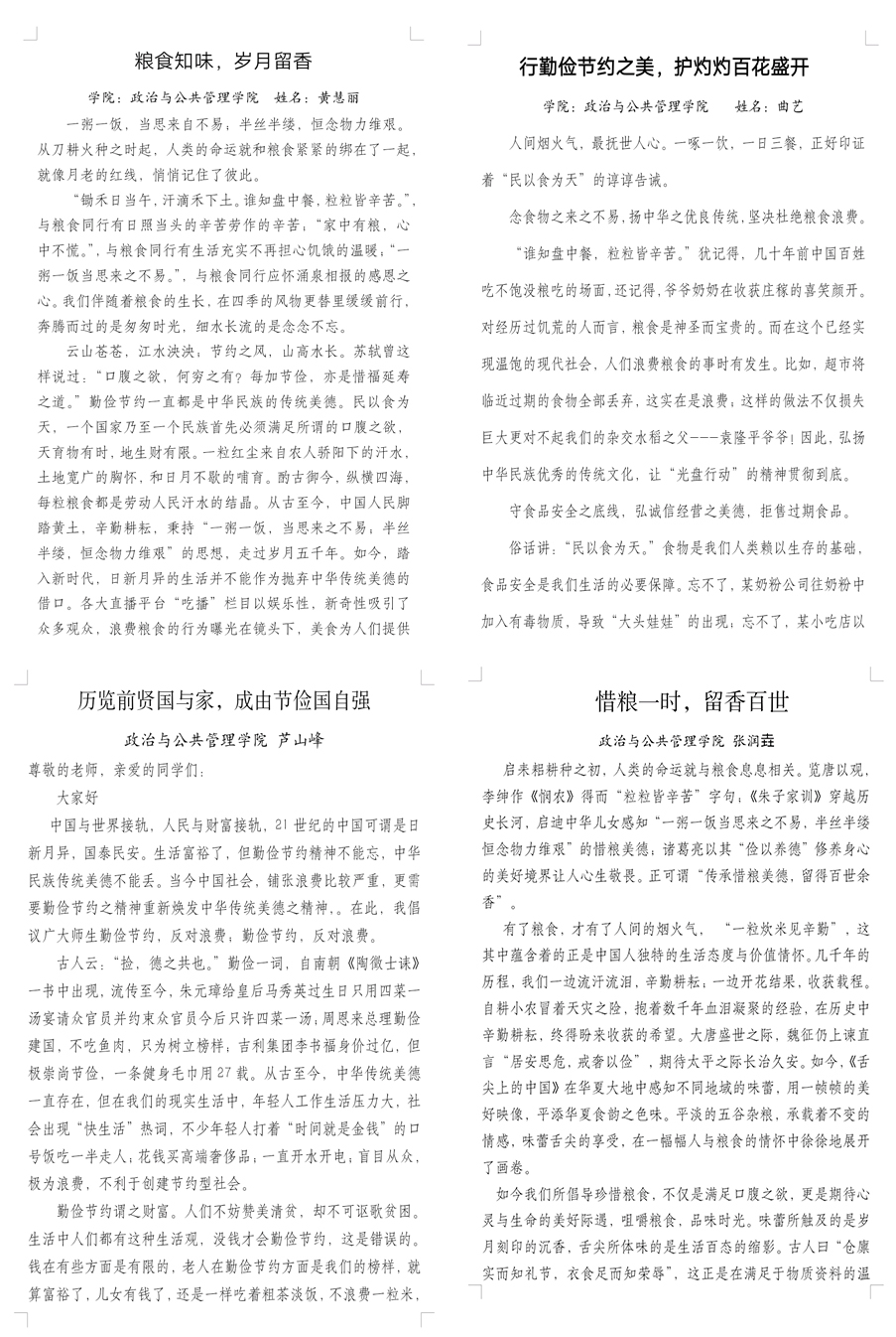粮食安全是国家安全的重要一环,粮食浪费是我国不容忽视的重要问题。为进一步强化思想引领,增强学生参与感,以文字形式丰富活动成果。学院以“我为‘节粮’做代言”为主题开展征文比赛,讲述老一辈的节约故事,发掘生活中践行节粮的人物、事件,学习回顾中华民族勤俭节约的传统美德。活动期间,学院陆续收到稿件20余篇,不乏触动心灵的佳作。征文比赛活动对于引发同学们“勤俭节粮”的内在认同,扩大“节粮”宣传影响力、号召力发挥了重要作用。