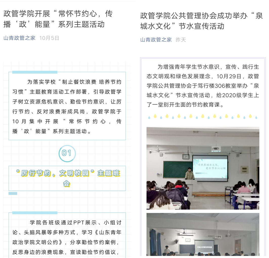 为扩大网络育人实效,扩展“点—线—面”全覆盖的网络思政新阵地,学院通过“山青政管之家”微信公众号、抖音号、微博等宣传阵地,记录活动重要时刻,发掘政管学子在节约实践背后不为人知的故事,现已制作微信推文4篇,累计阅读量700余次,营造了“人人讲节约,人人争节约”的良好氛围,切实强化了思想引领,扩大活动影响,巩固活动成果。