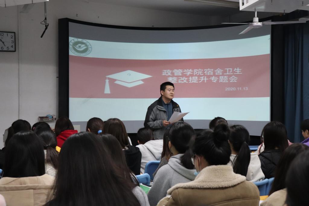 为扎实推进《学生社区卫生管理规定》落实,切实改善宿舍环境,帮助学生培养良好卫生习惯,11月13日下午,政管学院在敏行楼103室召开宿舍卫生整改专题会,政管学院各宿舍长参加本次会议,会议由政管学院辅导员张明伟主持。
