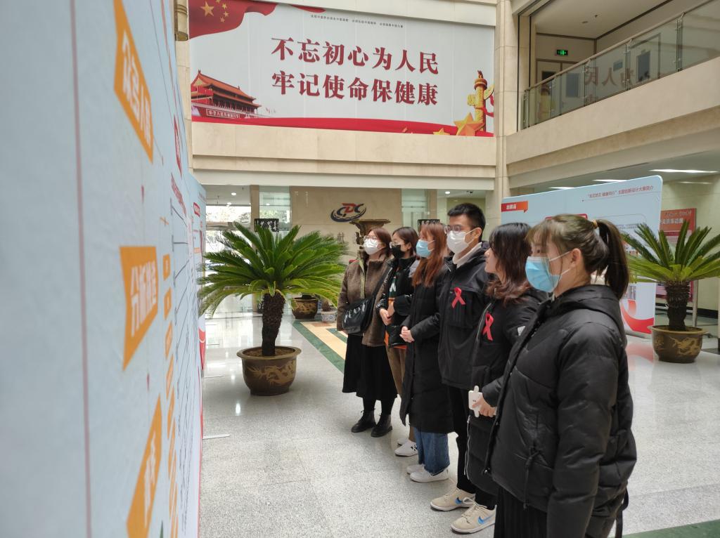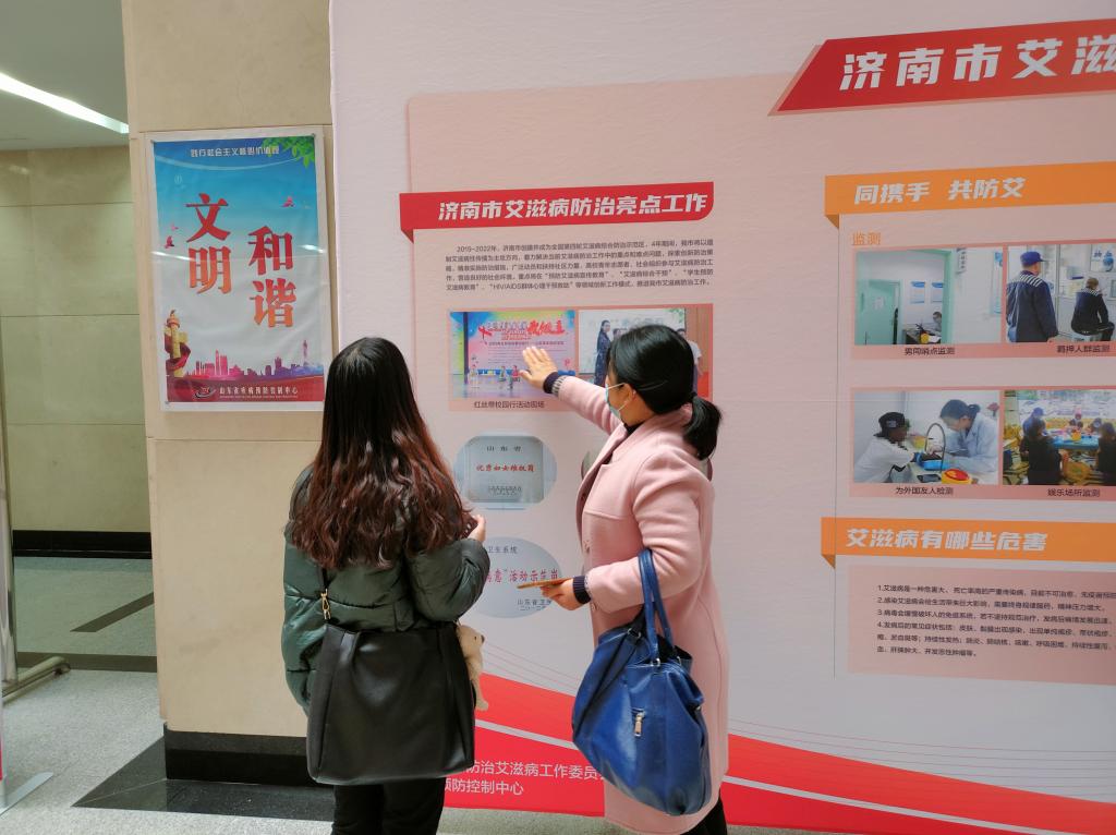 志愿者们在一楼展厅依次参观了此次活动的优秀工作展和作品展。展板向学员们展示了山东省2020年艾滋病防治工作的工作成果,让学员们感受到了我省为艾滋病防治工作的辛勤付出。其中,在“济南市艾滋病示范区建设”的展板处,我校承办的红丝带青春校园行防艾活动做为“济南市艾滋病防治亮点工作”被展出。此外,展板还向学员们展示了众多有关防治艾滋病的宣传作品,为艾滋病发声,这也让学员们深刻的认识到我省对艾滋病防控工作的高度重视。