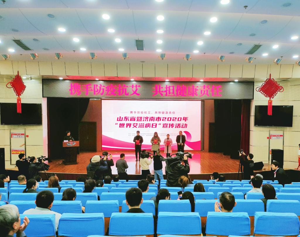 上午9时,志愿者们参加了此次宣传活动仪式。仪式展演了山东省“知艾防艾、健康同行”主题设计大赛获奖部分作品,省市领导为大赛获奖个人代表颁发证书。我校拍摄的《知“艾”》视频作品,荣获此次主题设计大赛一等奖。