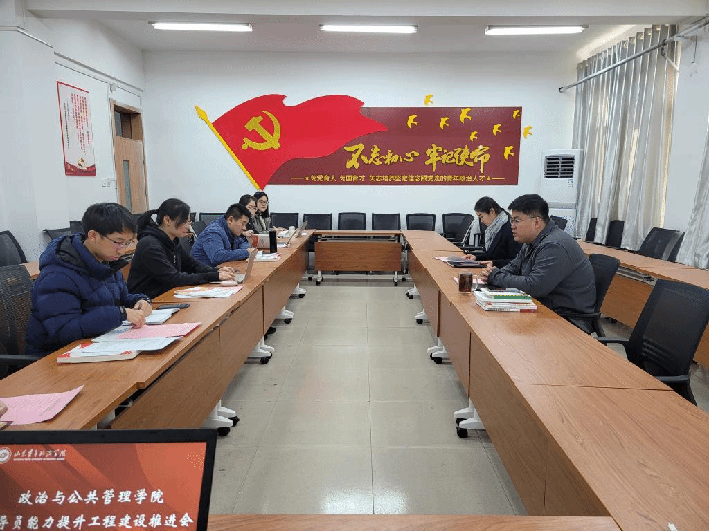 为切实增强学院辅导员的理论素养和工作能力,做好寒假及2021年思政工作的谋划部署,激发辅导员工作的积极性、主动性、创造性,1月18日上午,政治与公共管理学院辅导员能力提升工程建设推进会在敏行楼104室成功举办。学院党总支书记丁萍、副书记王正坤和全体辅导员参加此次会议,会议由王正坤主持。