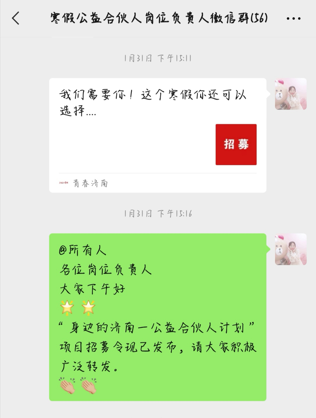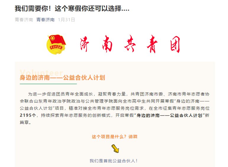 为进一步拓展志愿服务共建,服务济南市青年团员发展,加强青年团员价值引领,提升青年团员思想建设水平,打造高素质、高水平青年志愿者队伍,为全市志愿服务发展凝心聚力。寒假期间,政治与公共管理学院联合共青团济南市委、市青年志愿者协会持续开展“身边的济南——公益合伙人计划”项目。