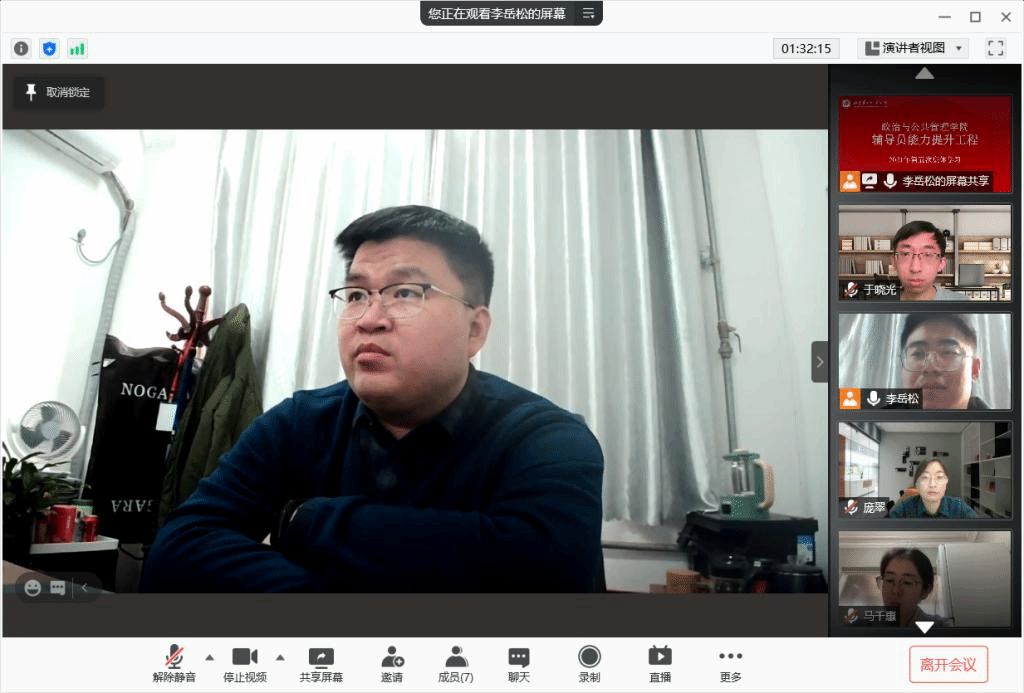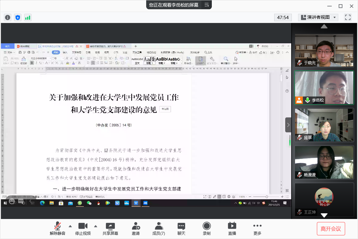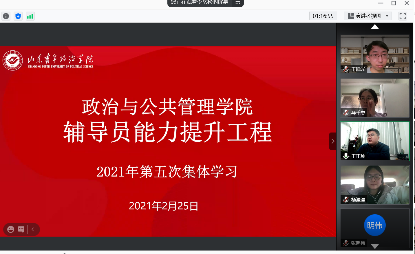 为进一步推进学院辅导员能力提升筑基工程,不断加强和完善学生党支部发展建设,切实增强学院辅导员的理论素养和工作能力,突出学院工作特色,2月25日下午,政治与公共管理学院辅导员能力提升工程2021年第五次集体学习活动在腾讯会议线上举行,学院全体辅导员参加此次学习活动,辅导员李岳松领学。