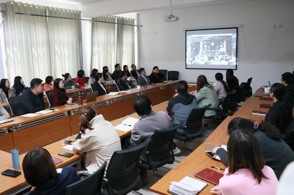会上,全体教职工集体观看新华社《国家相册》微纪录片第100期——《历史的致敬》。纪录片带领观众走进中国照片档案馆,将中国百年来跌宕起伏、风云激荡的历史以动态图片的形式呈现出来,使观众在尘封的相册中感受最鲜活的历史现场。丁萍为大家介绍了新华社《国家相册》诞生的背景和基本情况,传达了习近平总书记关于党史学习教育的重要论述,强调了多种形式开展党史学习教育的重要性,要求学院各支部、学团组织要结合党史学习教育,广泛通过“三会一课”、主题班会、主题团日活动等多种形式组织收看新华社《国家相册》,并深入交流收看学习的心得体会。
