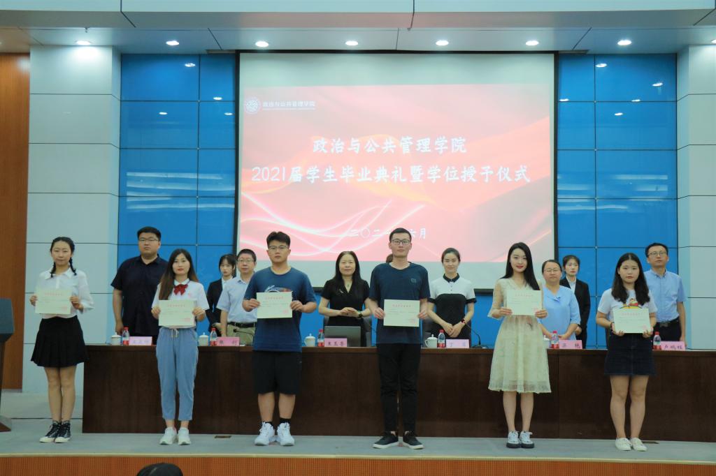 毕业典礼在庄严的国歌声中拉开序幕,学院副院长张剑宣读了《政治与公共管理学院关于授予2021届毕业生学士学位的决定》。党总支副书记王正坤宣读了《政治与公共管理学院2021届省级优秀毕业生、校级优秀毕业生名单》,学院领导为优秀毕业生代表颁奖。