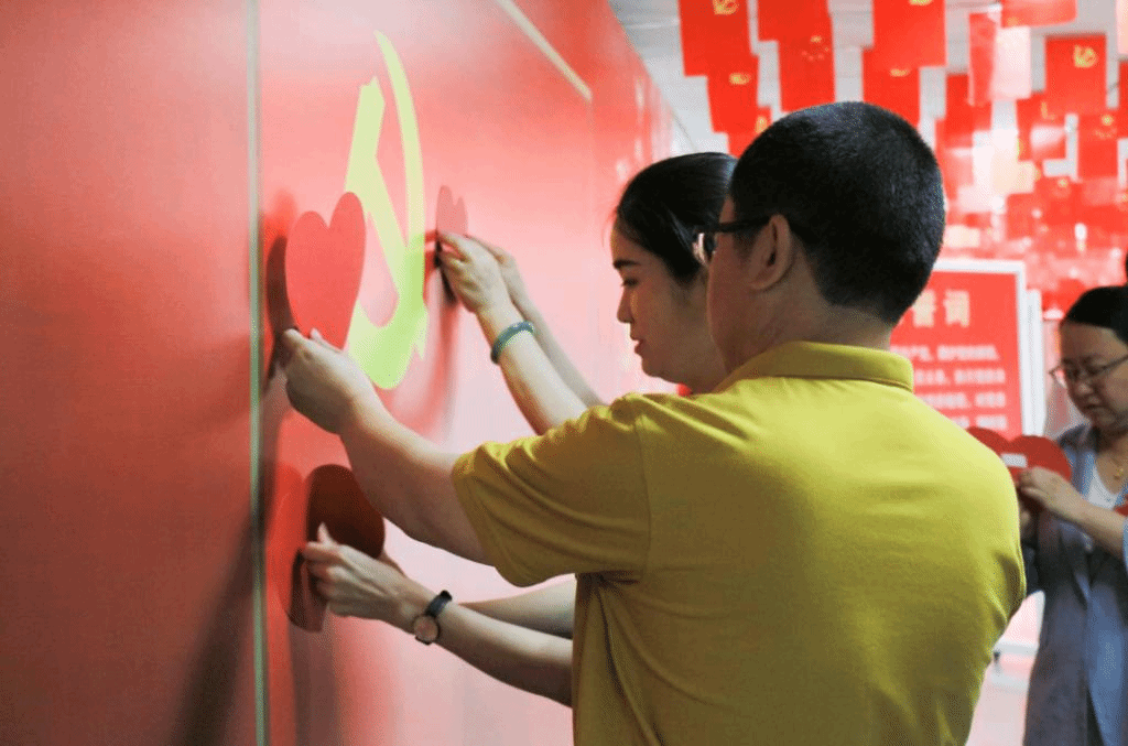 一颗红心永向党。活动最后,党员们用手中的红心卡纸填满展架上的党旗,为党旗增添一抹鲜艳的红色,并纷纷与党旗合影留念,向伟大的中国共产党成立100周年送上最真挚的祝福,表达最赤诚的热爱。
