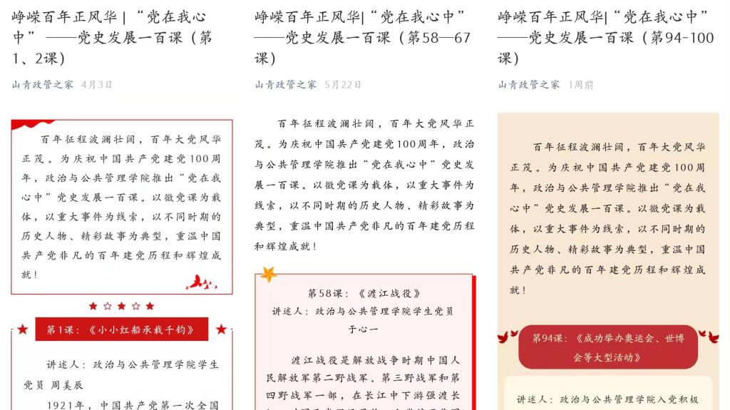 党的发展历史分成新民主主义革命时期、社会主义革命和建设时期以及改革开放和社会主义现代化建设新时期三个阶段, “党史发展一百课”系列党课选取了中国共产党百年征程中具有代表性的事件进行录制。录制过程中,学生党员积极报名、入党积极分子踊跃参与。“党史发展一百课”系列累计推送12期共计100课内容,截至目前,累计阅读量超过20000次,在全院广大师生群体中引发热烈反响。