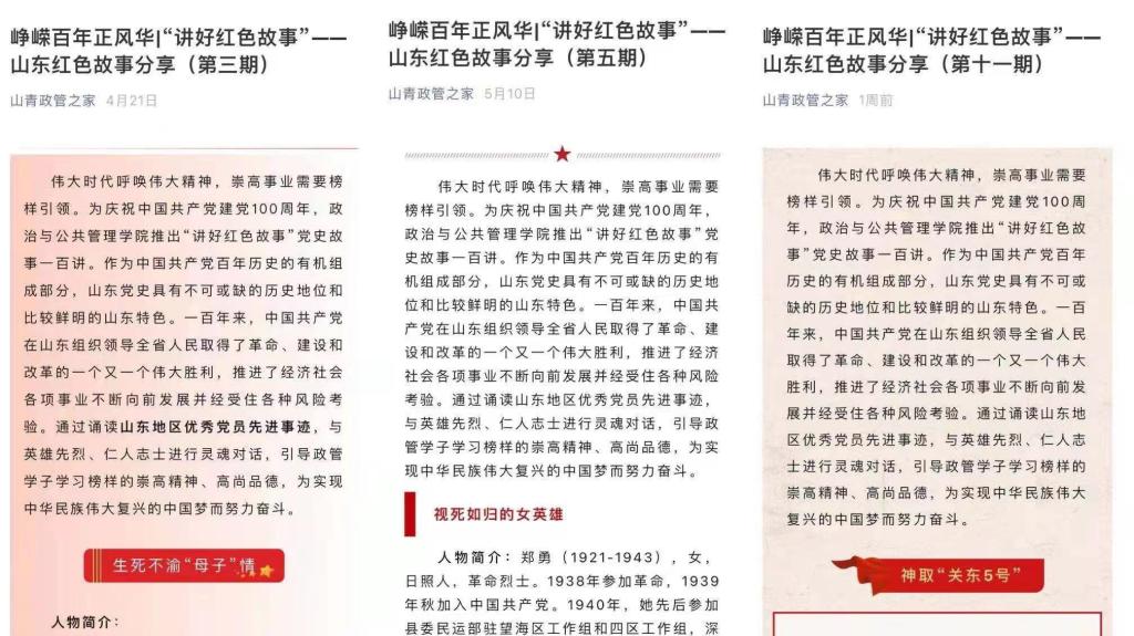 “红色故事一百讲”收集了包含革命先烈的浴血奋战、人民战士的忠贞坚韧、“沂蒙母亲”的大爱情怀、“山东红嫂”的无私奉献等多个山东优秀红色故事,这些故事可歌可泣,催人奋进,引人入胜。在录制过程中,学生党员积极报名、入党积极分子踊跃参与,用心讲好红色故事。“红色故事一百讲”系列推送11期共计100课内容,累计阅读量万余次,在全学院广大师生群体中引发热烈反响。