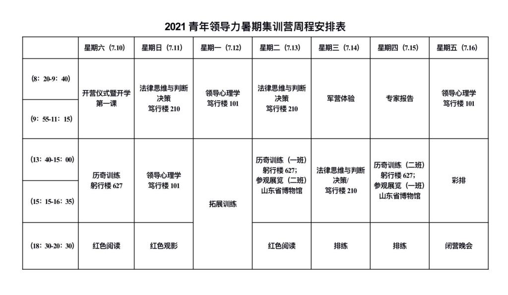 7月10日至16日,青年领导力学位班举办了为期7天的2021“砺行集训营”。本次集训营精心设计了理论课程、专家讲座、实践锻炼、活动组织四大板块,内容丰富、节奏适宜、形式多样,激发培养了学生自主学习、自我管理、敢于创新、团结协作、勇挑重担的“青年领导力”要素,完成了学位班既定计划,育人工作初见成效。