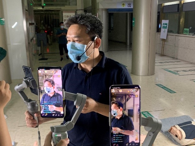 此次科普直播通过“急救乂生”、“心肺复苏科普”和“山青政管之家”三个抖音账号同步直播。李晓鲁主任首先从“什么是心肺复苏”“心肺复苏方法”“心肺复苏的意义”三个方面进行了线上讲座。随后,李主任与来自山东第一医科大学第一附属医院的急救医护团队带领直播间的同学们走进千佛山医院急诊科室,现场讲解急诊流程和内部工作流程,模拟了急诊就医故事,并进行了心肺复苏现场操作教学,带领直播间的同学们身临其境地感受和学习了心肺复苏知识和操作。