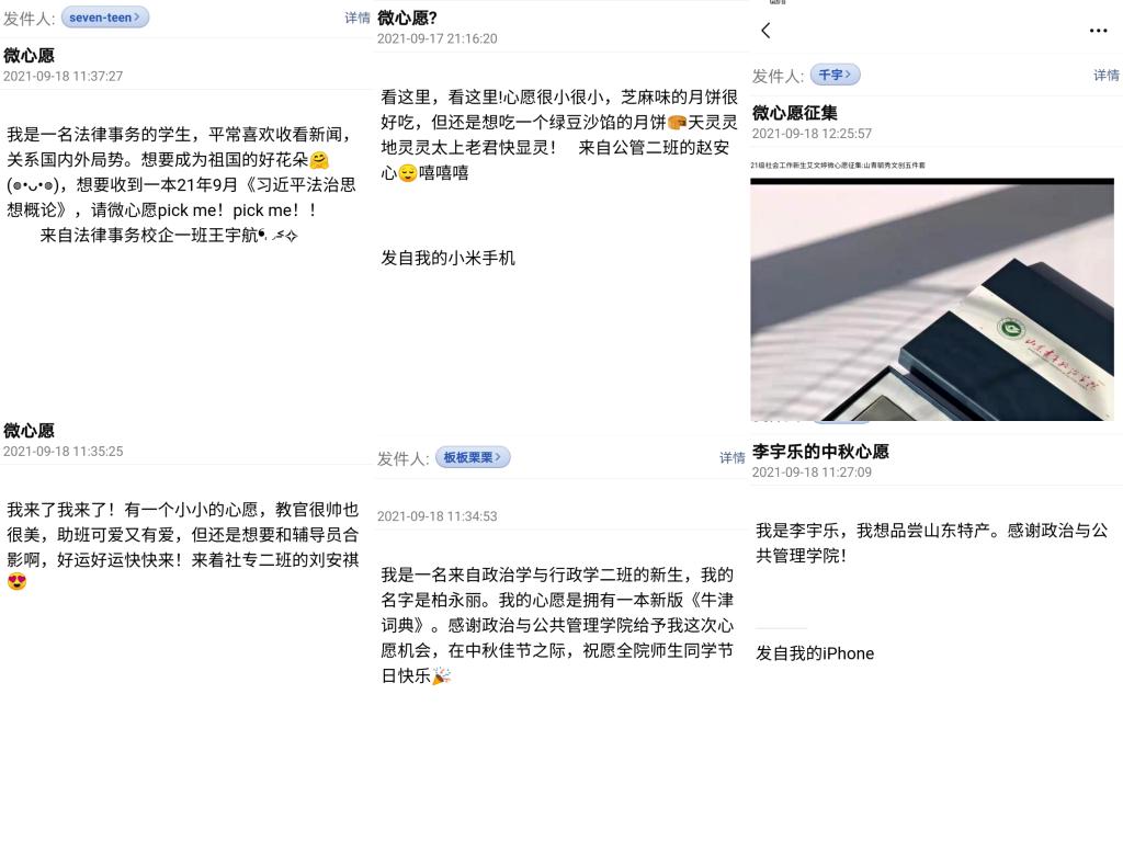 为切实做到为同学办实事,帮助新生融入政管大家庭,学院特别策划了“微心愿”征集活动。新生可以通过发送邮件许下心愿,由党员帮同学们实现。自活动启动以来,同学们踊跃发来心愿:“芝麻味的月饼很好吃,还想吃一个绿豆沙馅的月饼。”“我喜欢看新闻,想要收到一本《法制思想概论》。”“想要一套山青毓秀文创产品。”