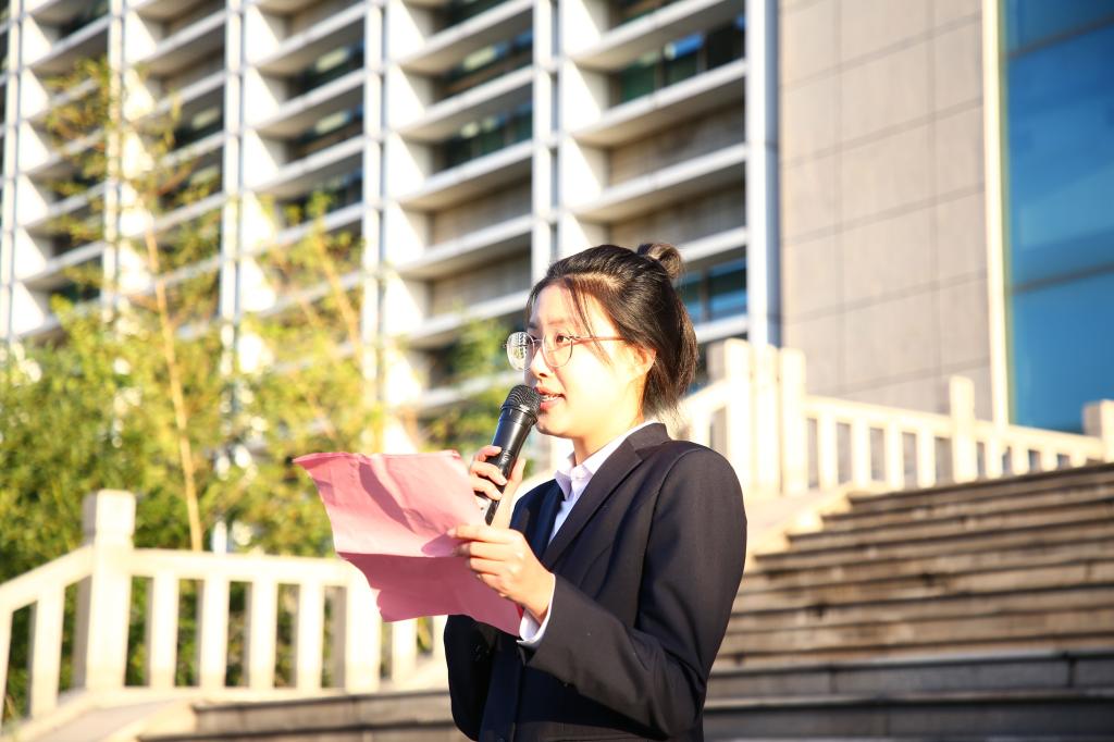 政治与公共管理学院2020级政治学与行政学二班肖林轩作为学生代表发言,她说到,作为新时代大学生,我们生逢盛世,肩负重任,要胸怀祖国、志存高远,真正的把爱国之志变成爱国之行,在激扬青春、开拓人生、奉献社会的进程中继续书写无愧于时代的壮丽篇章。作为政管学子,我们更要彰显出政管人的优秀品质,要带着钻研精神和学习热情,实现全面发展、和谐成长,同时更要心系国家、心系时事,用崇高理想鼓舞自己,用坚定信念鞭策自己,练就过硬本领,将个人奋斗融入国家发展,将个人的成长进步与祖国的发展同频共振。