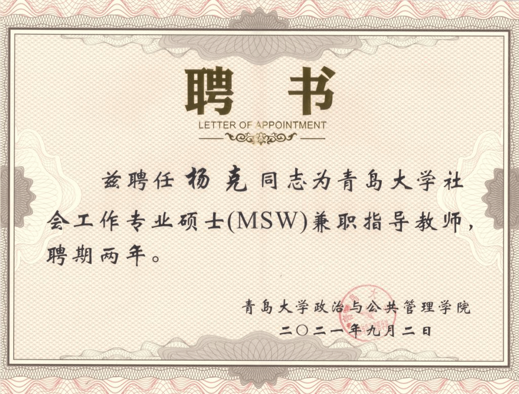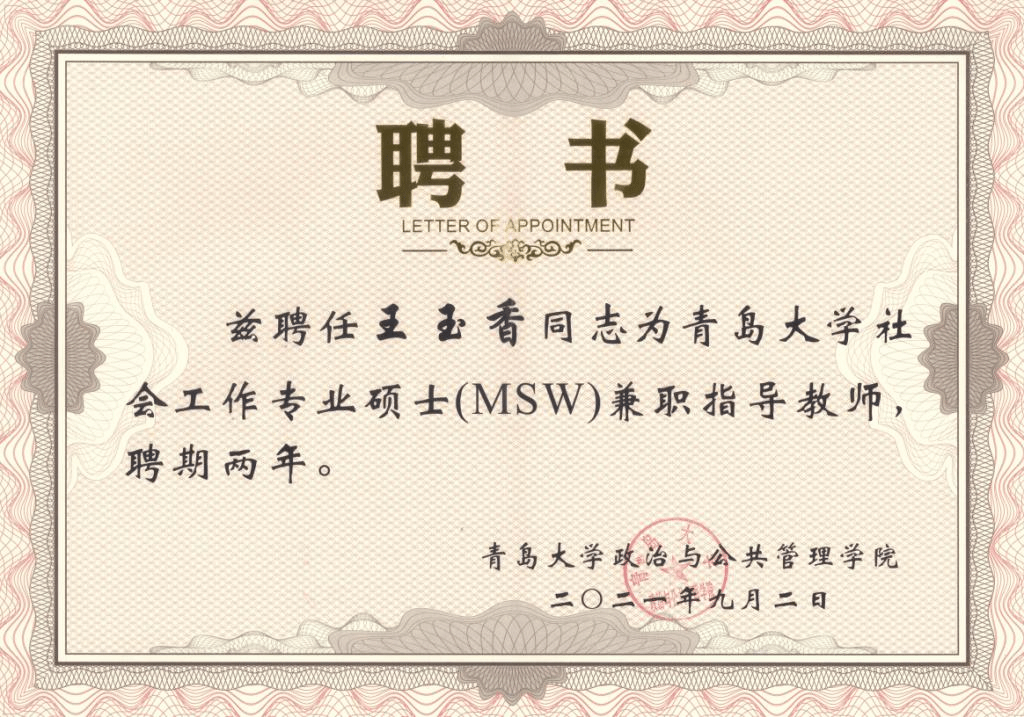 近日,我校政治与公共管理学院院长王玉香教授、社会工作专业学术带头人杨克教授被聘为青岛大学政治与公共管理学院社会工作专业硕士(MSW)导师。